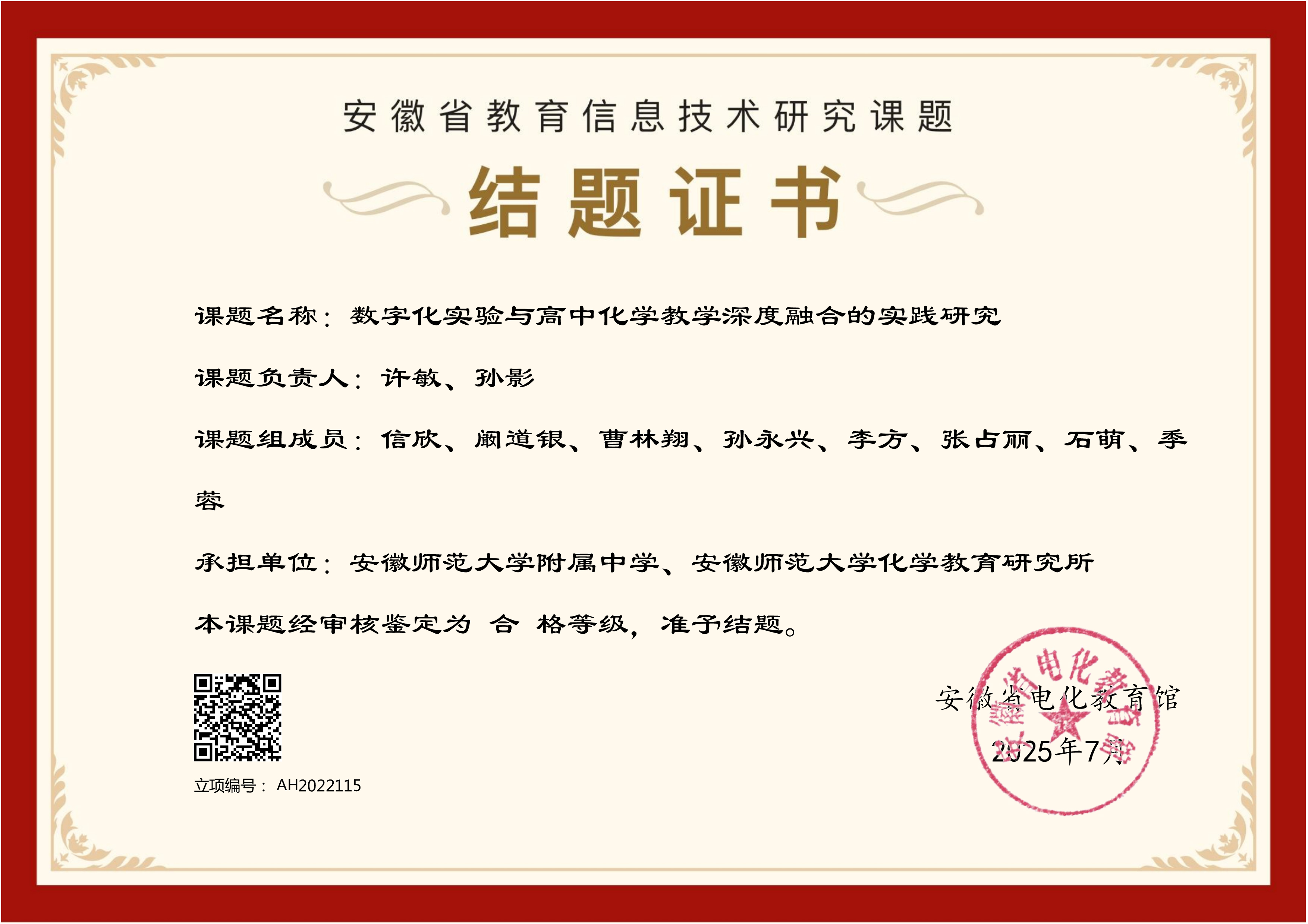 本网讯(文/孙永兴、许敏)近日,2025年安徽省教育信息技术研究课题结题名单公布,安徽师范大学附属中学(下称附中)教师许敏与安徽师范大学(下称安师大)教授孙影共同主持的课题《数字化实验与高中化学教学深度融合的实践研究》(课题编号:AH2022115)顺利通过专家评审,圆满结题。课题组成员包括信欣、阚道银、曹林翔、孙永兴、李方、张占丽、石萌、季蓉。