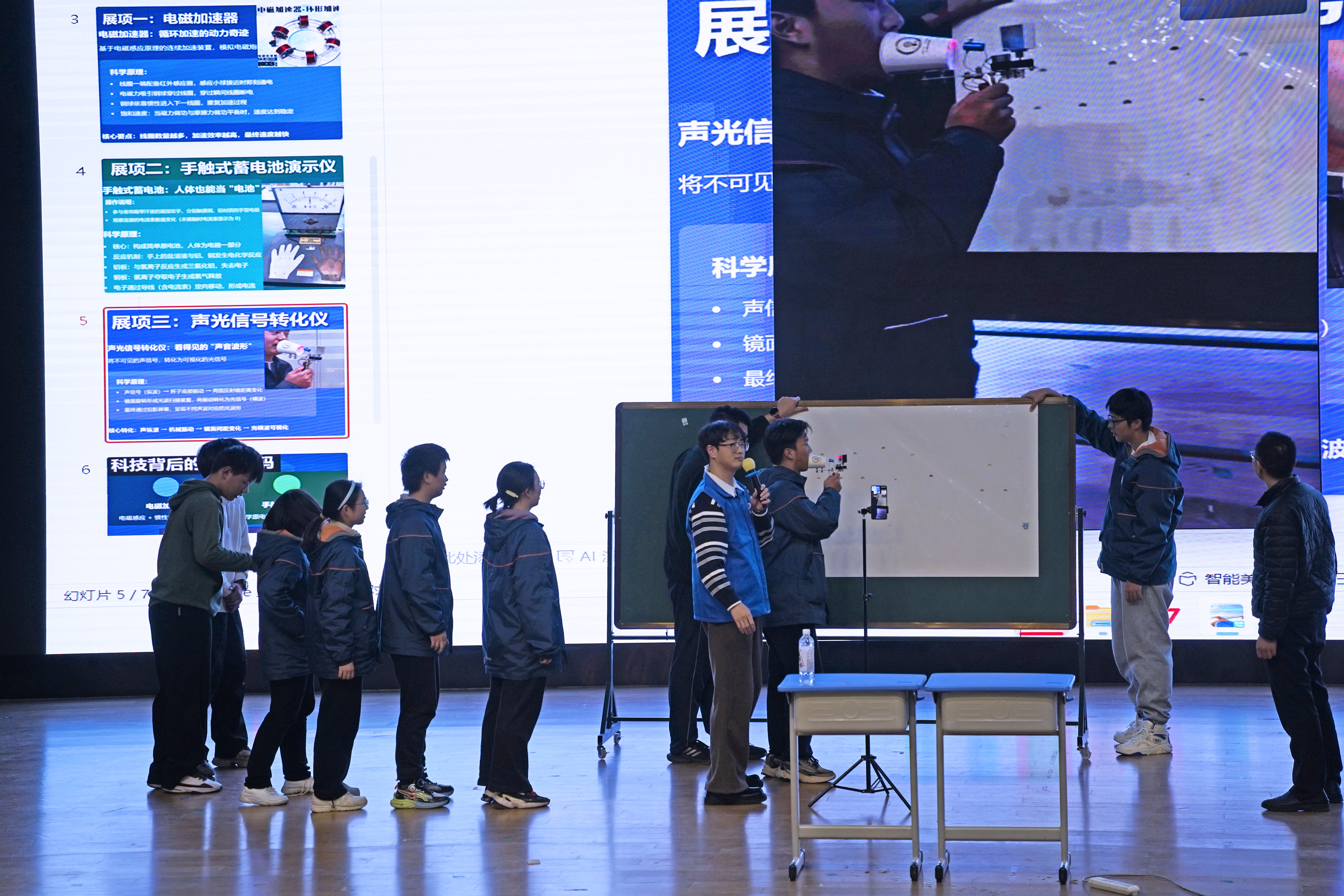 育英楼报告厅内,学长暖心录制的祝福视频率先温情暖场,随后高二展演以一场融合科学与艺术的环保服装秀惊艳启幕,瞬间点燃现场氛围。随后,安徽师范大学化材学院的系列演示接连释放化学魔力:“碘钟振荡”实验中,烧杯内色彩随规律变幻蓝金双色;“鲁米诺”实验让暗室中的模拟血迹幽幽发光;微型化学电池点亮灯珠的瞬间,更直观揭秘能量转化原理,奇幻光影令全场屏息。紧接着,安徽师范大学物电学院的演示掀起物理风暴:学生手触即发电的“蓄电池”颠覆认知;“电磁回旋加速器”展现无形磁场的强大力量;“声波转换仪”则将不可见的声音化作可见震动。压轴登场的附中物理组演示更将气氛推向顶点——“魔法球”凭指尖触碰点亮绚烂电弧,“火龙卷”装置让烈焰在旋转气流中扶摇直上,炽热的科学魅力感染全场的每一位学子。