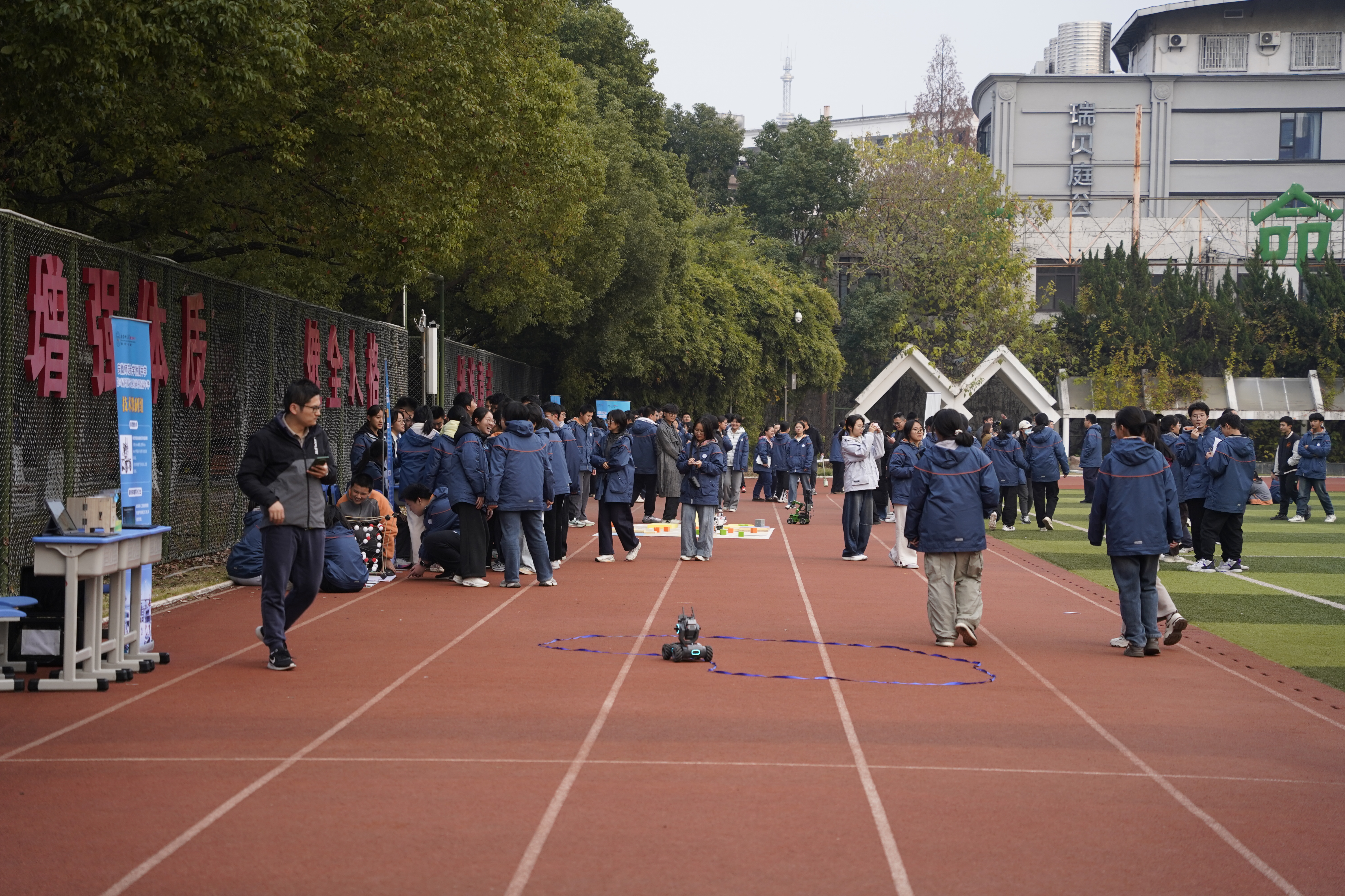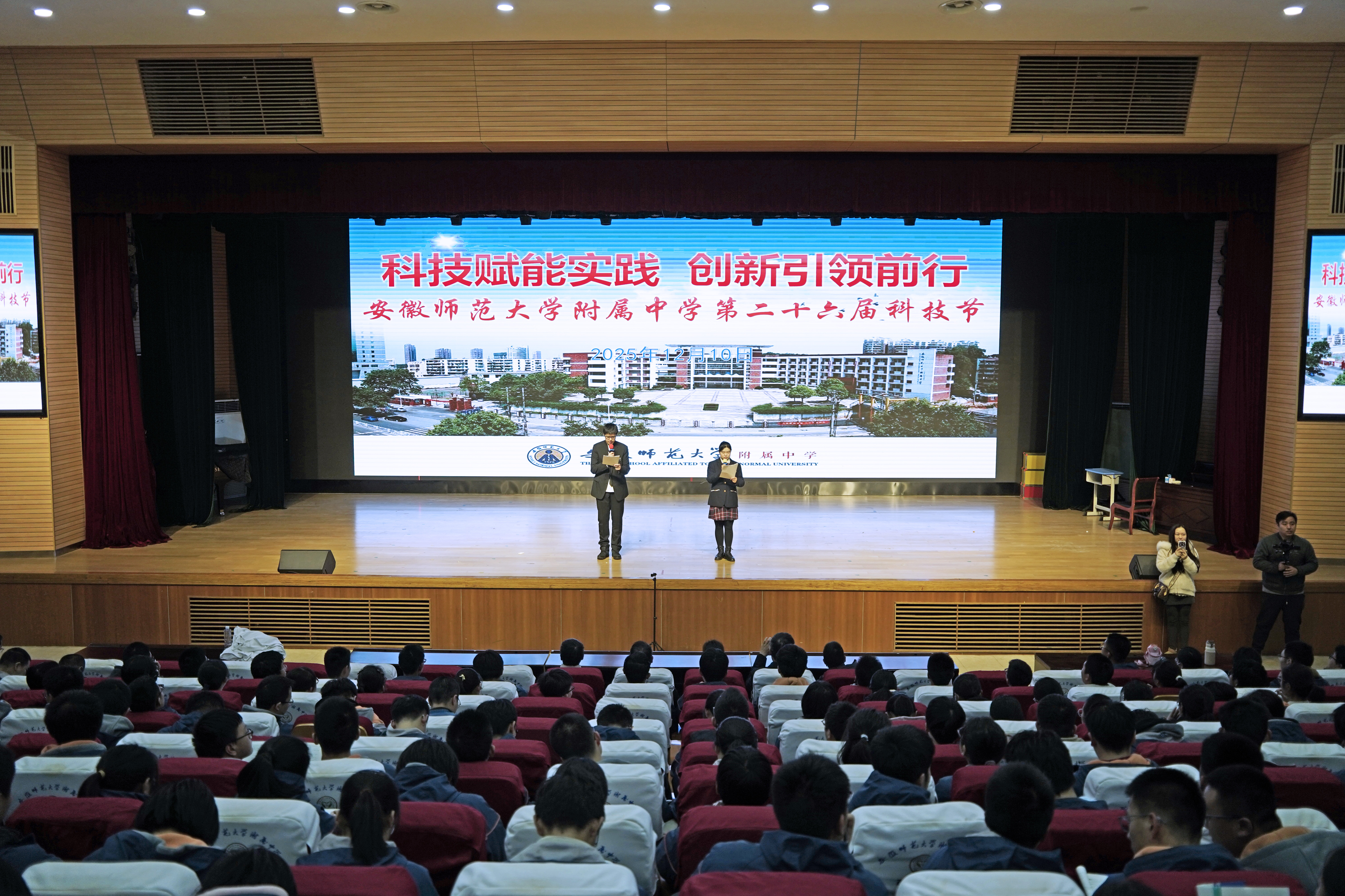 本网讯(附中 李居旖)12月10日下午,安徽师范大学附属中学(以下简称“附中”)第二十六届科技节之校园科技嘉年华在冬日的暖阳中活力绽放。本次活动按年级分设运动场与育英楼报告厅两大主场,联动高校资源与社会力量,为全体高一、高二学子打造了一场兼具专业性、互动性与震撼力的科技盛宴,让学子沉浸式感受科技酷炫魅力,全方位点燃科学探索热情。