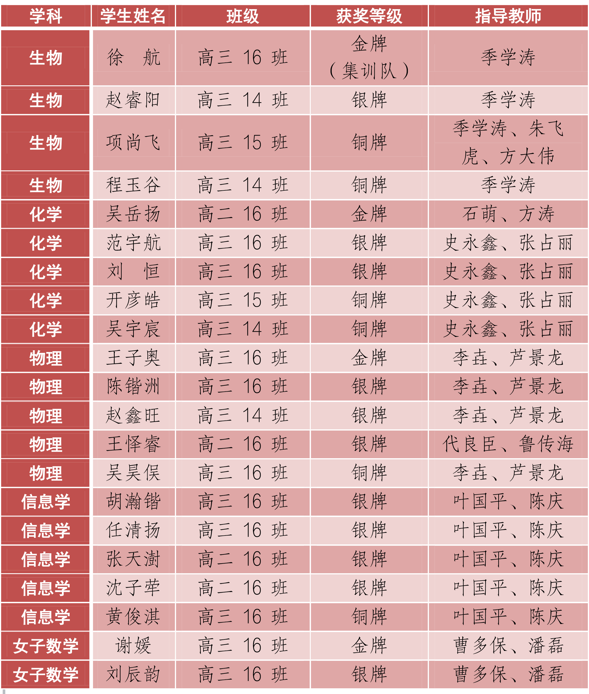 银牌集群:11枚银牌分布于生物学1枚、化学2枚、物理3枚、信息学4枚、女子数学1枚,形成了稳定的“奖牌梯队”。11枚银牌占全省银牌总数的25%,银牌数位居全省第二,在各学科竞争中保持稳定优势。