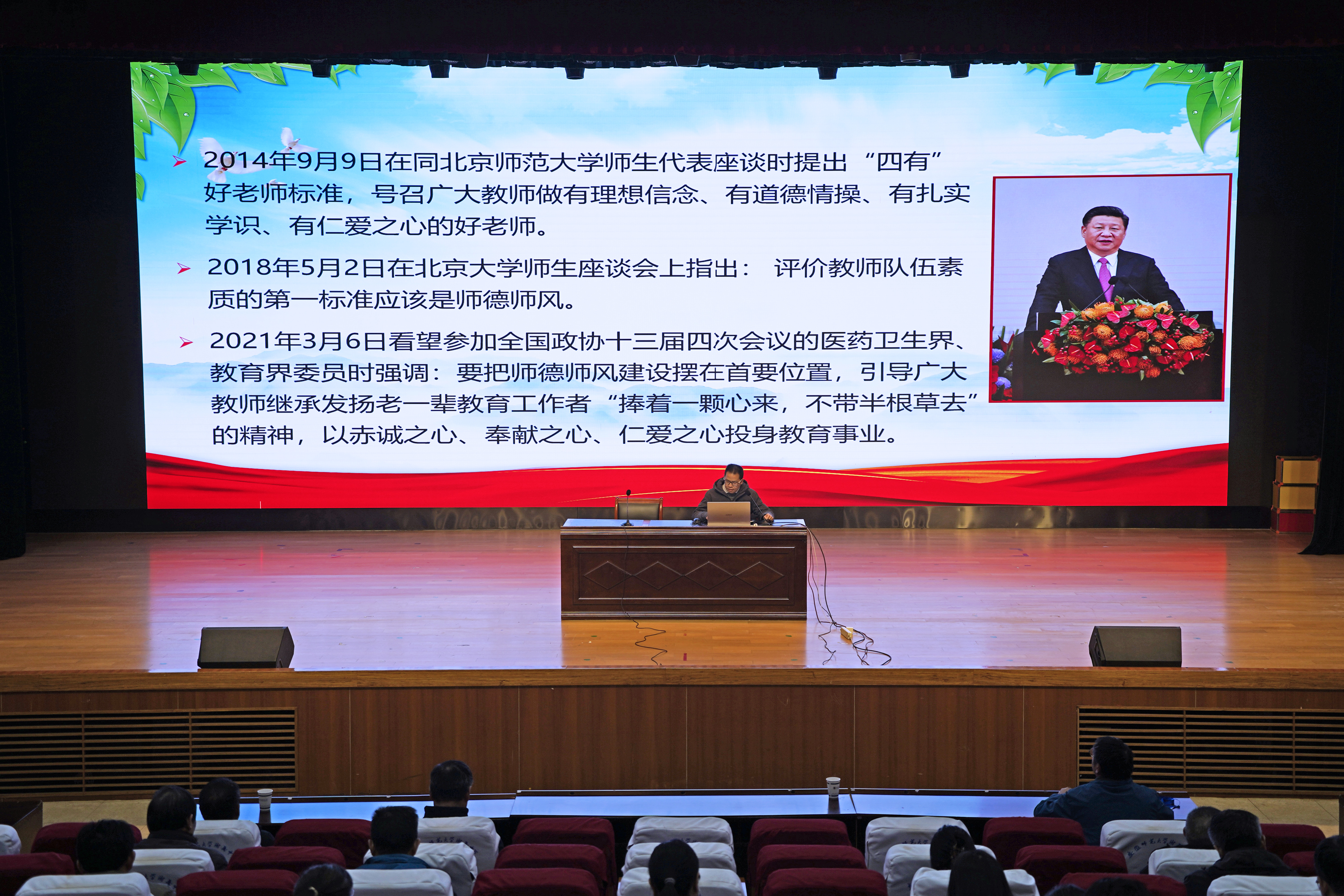 纪委书记、副校长叶国平作《师德师风 警示教育——准确把握师德师风第一标准》主题报告。会上,叶国平带领全体教职工重温了习近平总书记近年来关于师德师风建设的系列重要讲话精神。从2014年提出“四有”好老师标准,到2018年明确“评价教师队伍素质的第一标准应该是师德师风”,再到2023年强调“躬耕教坛、强国有我”的志向抱负与弘扬教育家精神的殷切嘱托。叶国平结合教育事业发展新形势对讲话精神进行系统解读,帮助教职工深化思想认识。