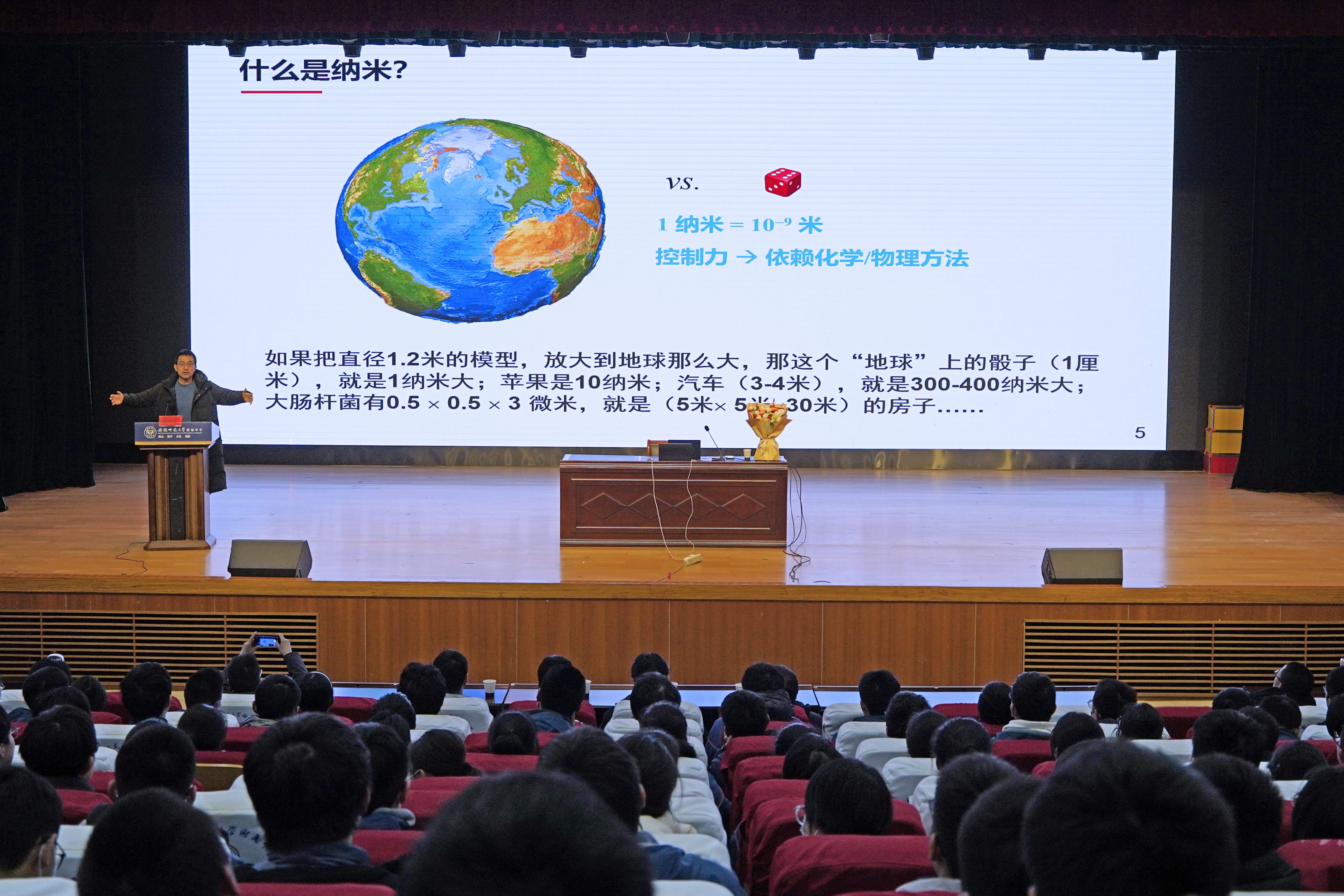 本次科普报告会的核心环节,由陈虹宇教授以《纳米合成方法学——微小世界的魔法师》为题作专题分享。作为纳米科学领域颇具影响力的学者,陈虹宇凭借深厚的学术积淀和丰硕的科研成果,为现场师生带来了一场兼具科学性与趣味性的知识盛宴。报告中,他巧妙地将纳米合成这一前沿科学主题与艺术、生活场景相结合,以“纳米合成魔法师”的生动定位,循序渐进地为师生们揭开了纳米世界的神秘面纱。