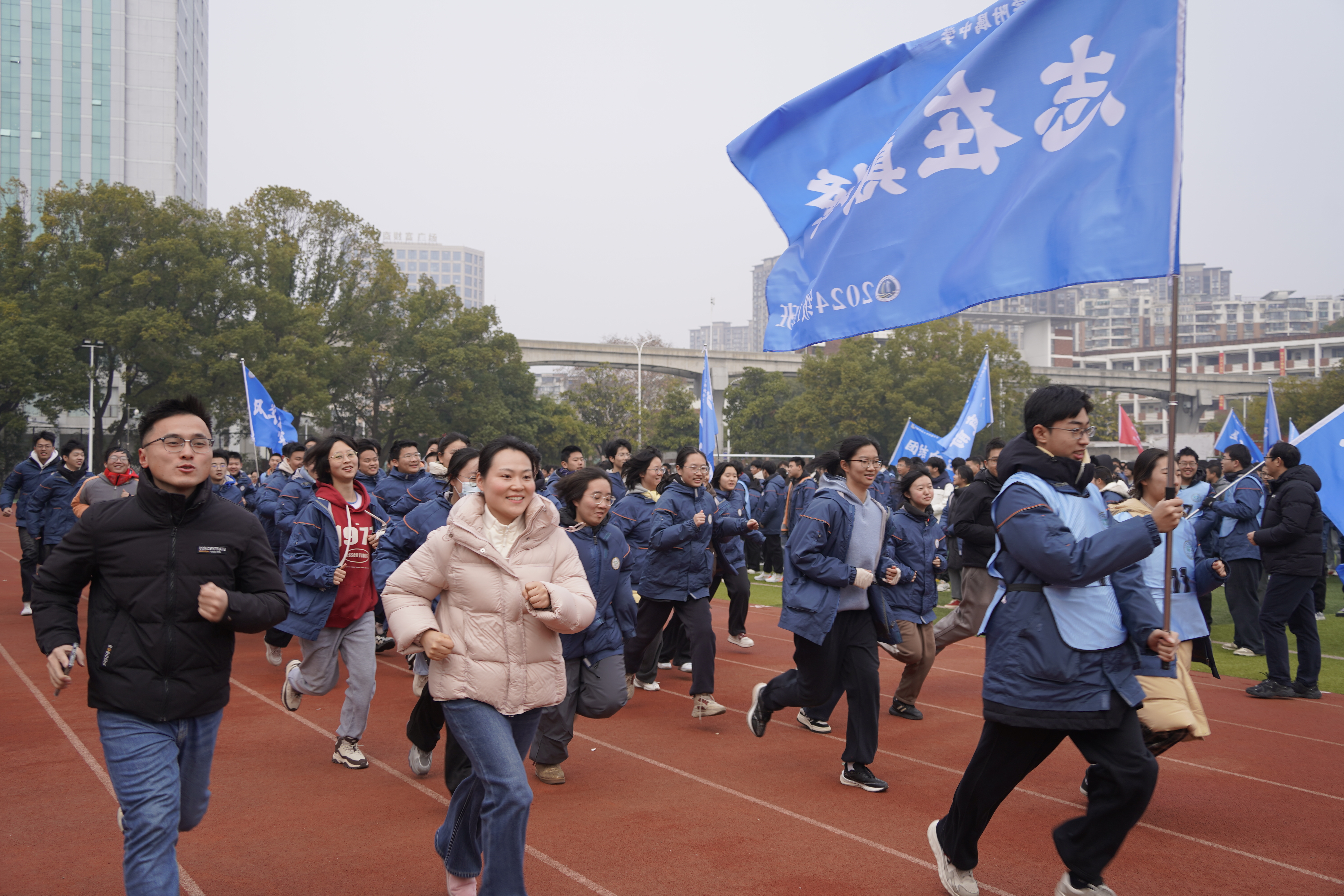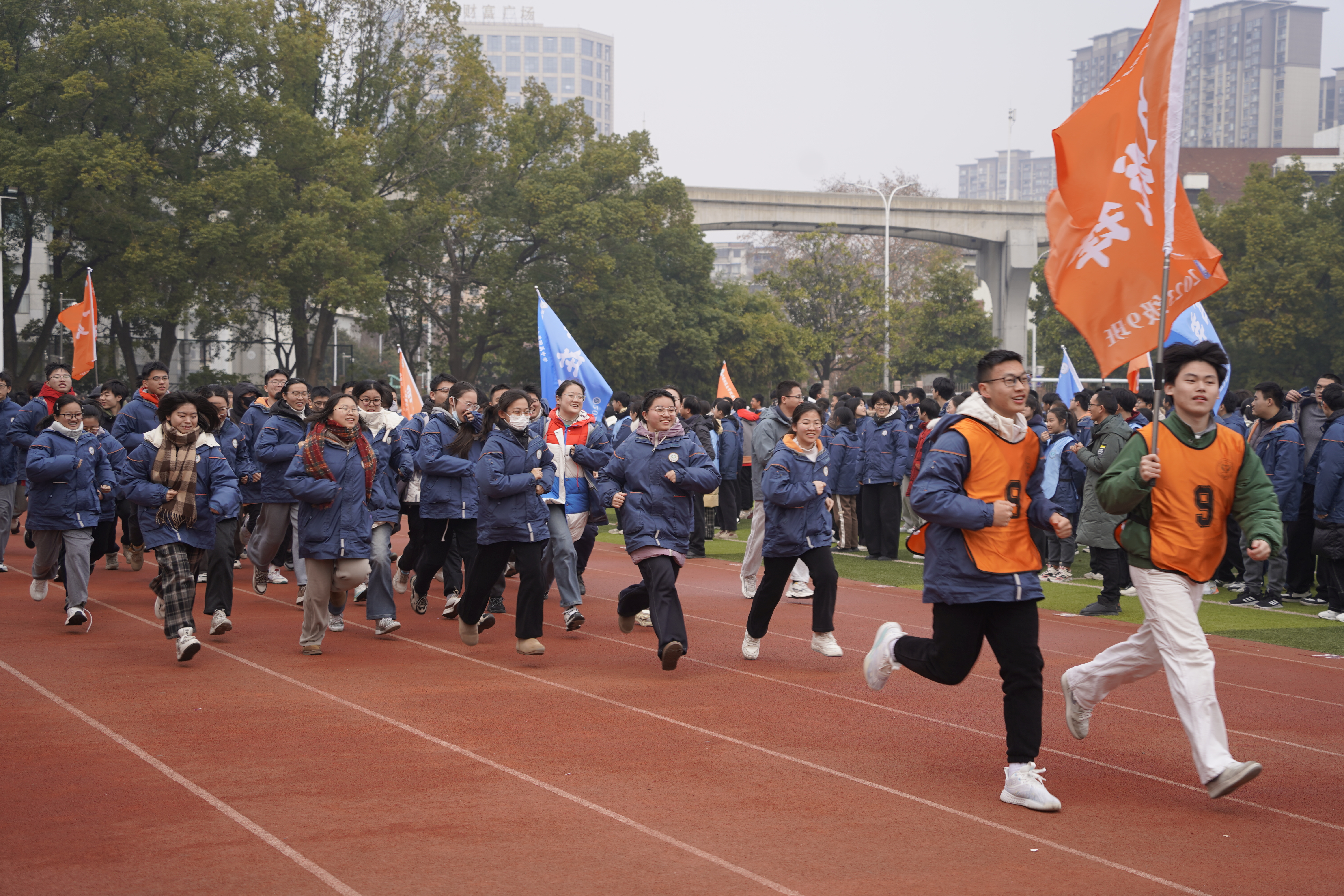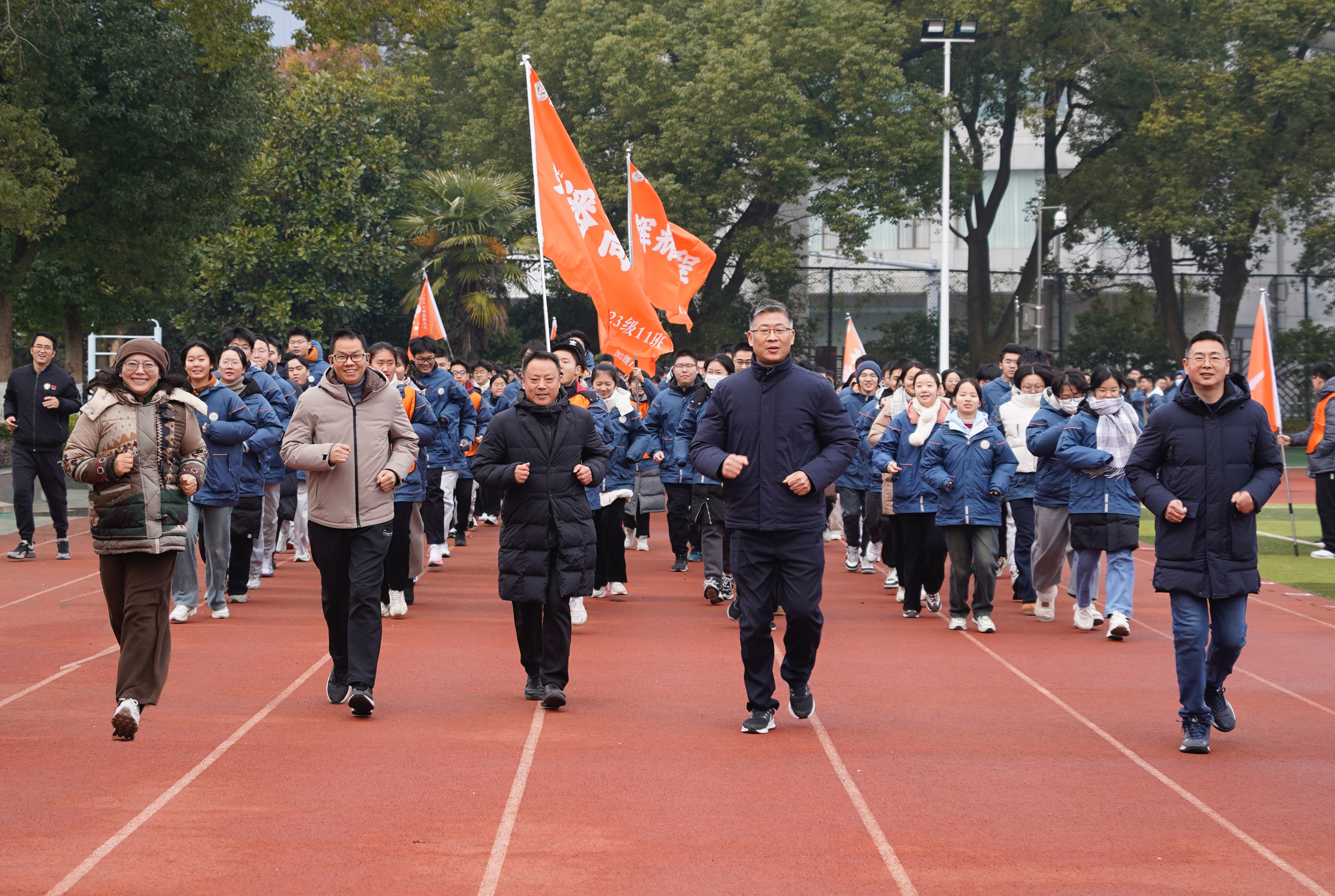 伴随着雄壮的国歌,鲜艳的五星红旗冉冉升起,全体师生庄严肃立,行注目礼,在庄严的氛围中开启本次迎新活动。随着党委书记夏吉中宣布“开跑”,校长毛宣海鸣响发令枪,高一、高二、高三年级学子们手举各色主题旗帜,身着统一校服,以饱满的精神踏上跑道。校领导班子成员率先领跑,师生们紧随其后,围绕校园并肩奔跑。队伍中,橙色、蓝色、绿色的旗帜迎风招展、猎猎飞扬,“踏浪前行”“瀚海扬帆”“蟾宫折桂”“勇‘潘’高峰”“辉耀征程”等醒目标语格外亮眼,既彰显着附中学子的少年意气,也饱含着对新一年的美好期许。奔跑的身影、嘹亮的口号、飘扬的旗帜,交织成冬日校园里最鲜活的画卷,洋溢着蓬勃的朝气与奋进的热情,感染着校园里的每一个人。