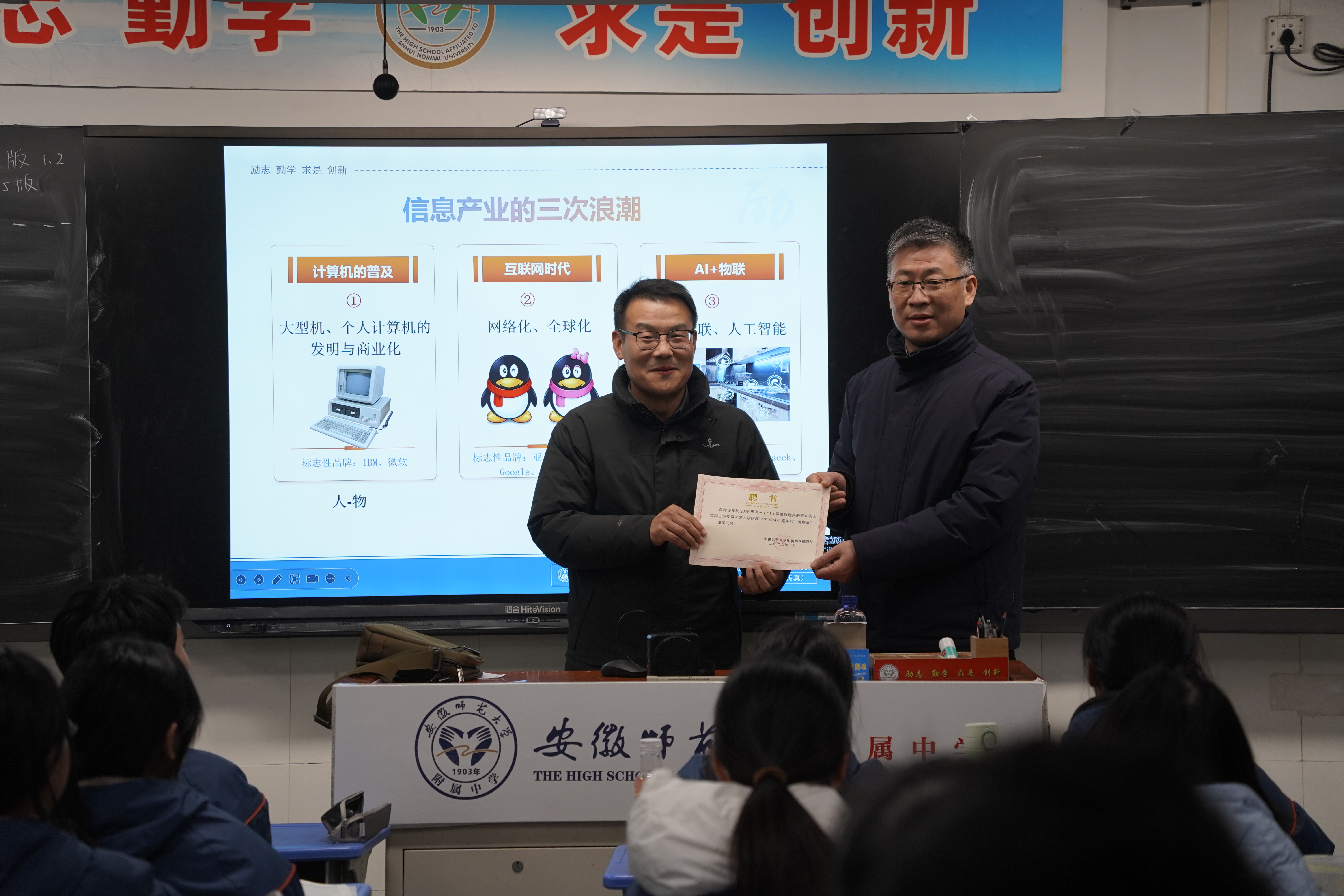 本网讯(学生发展中心 金玥)为帮助高一学生拓宽生涯视野,明晰成长方向,充分发挥家校协同育人的桥梁作用,1月5日,安徽师范大学附属中学(下称附中)成功举办第八届家长进课堂之职业生涯分享会活动。活动邀请了来自不同行业的家长代表分享职业成长故事,校长毛宣海、副校长白凌志、德育处副主任谢莉、高一班主任等参与本次活动。