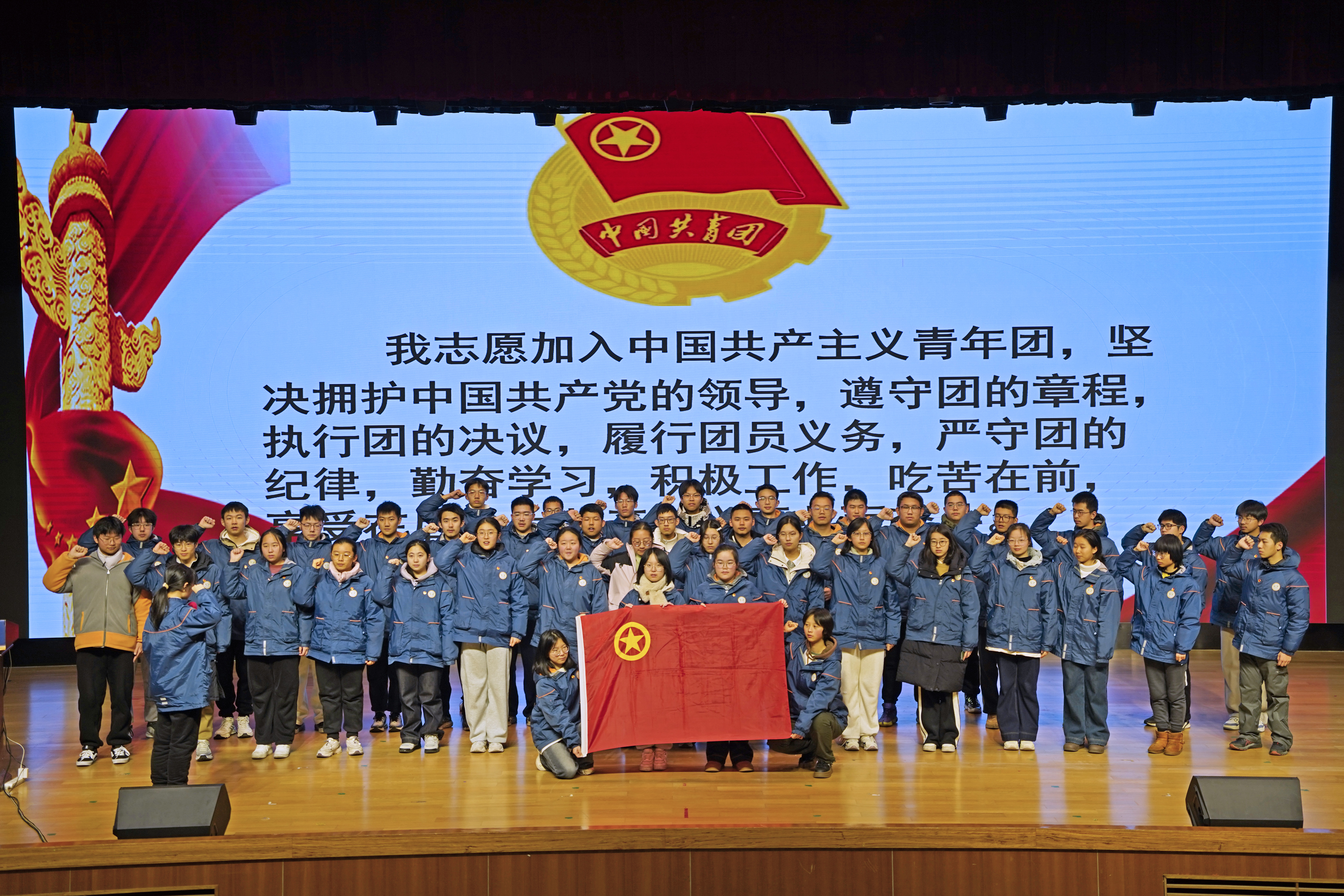仪式最后,全体人员起立奏唱《光荣啊,中国共青团》,激昂的旋律为此次入团仪式画上圆满句号。入团既是荣誉的加冕,更是责任的传承,愿新团员以此次仪式为新起点,牢记入团誓词,深学笃行党的二十届四中全会精神,以青春之我、奋斗之我在共青团的大熔炉中淬炼成长,用理想、本领与担当书写无愧于时代的青春答卷,为实现中华民族伟大复兴的中国梦注入源源不断的青春力量。