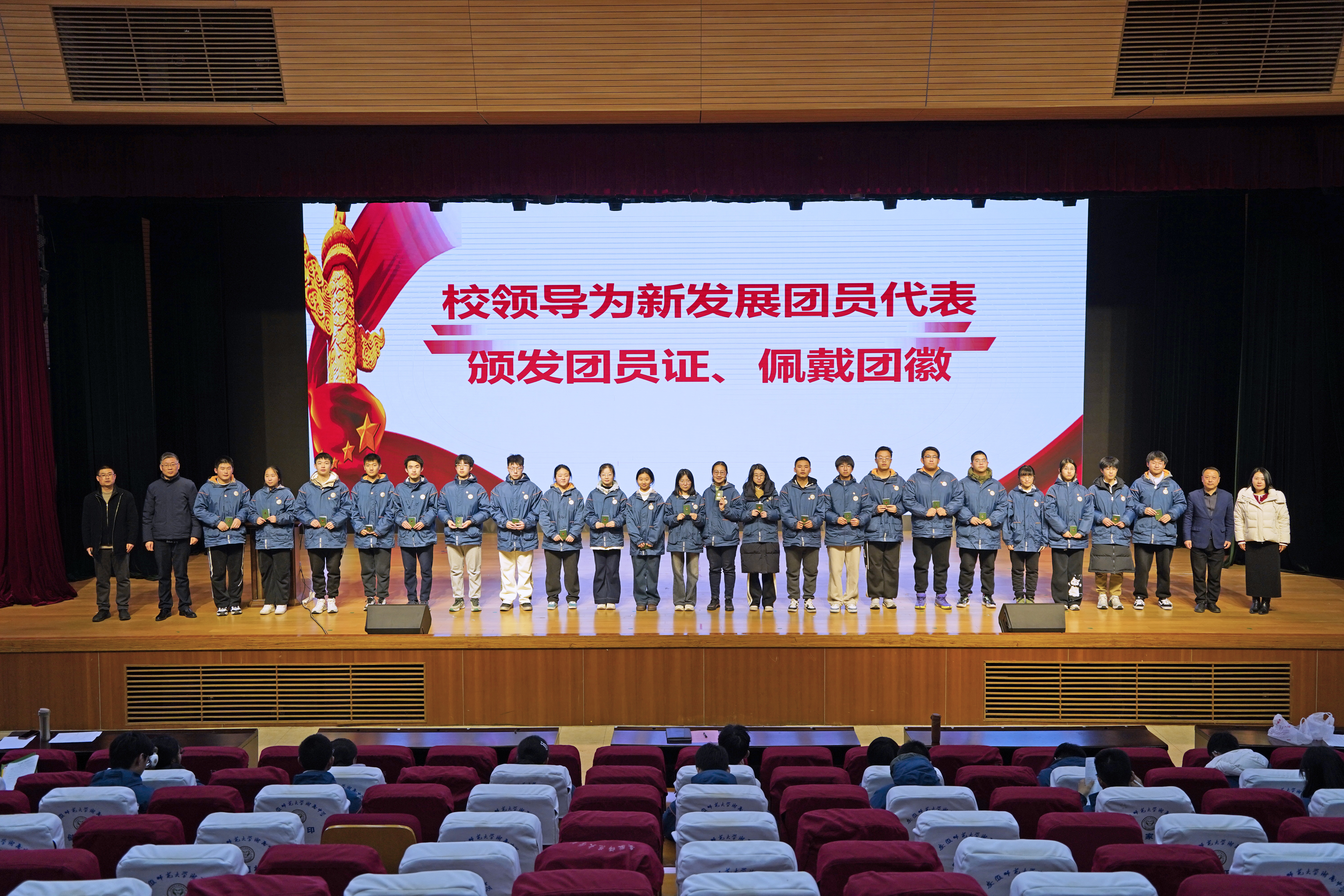 仪式在雄壮的国歌声中拉开序幕,谢莉宣布新团员名单。校领导为新发展团员代表郑重颁发团员证、佩戴团徽。当熠熠生辉的团徽缀于胸前,新团员们的责任感与使命感油然而生,这枚徽章成为他们践行青春誓言的重要象征。