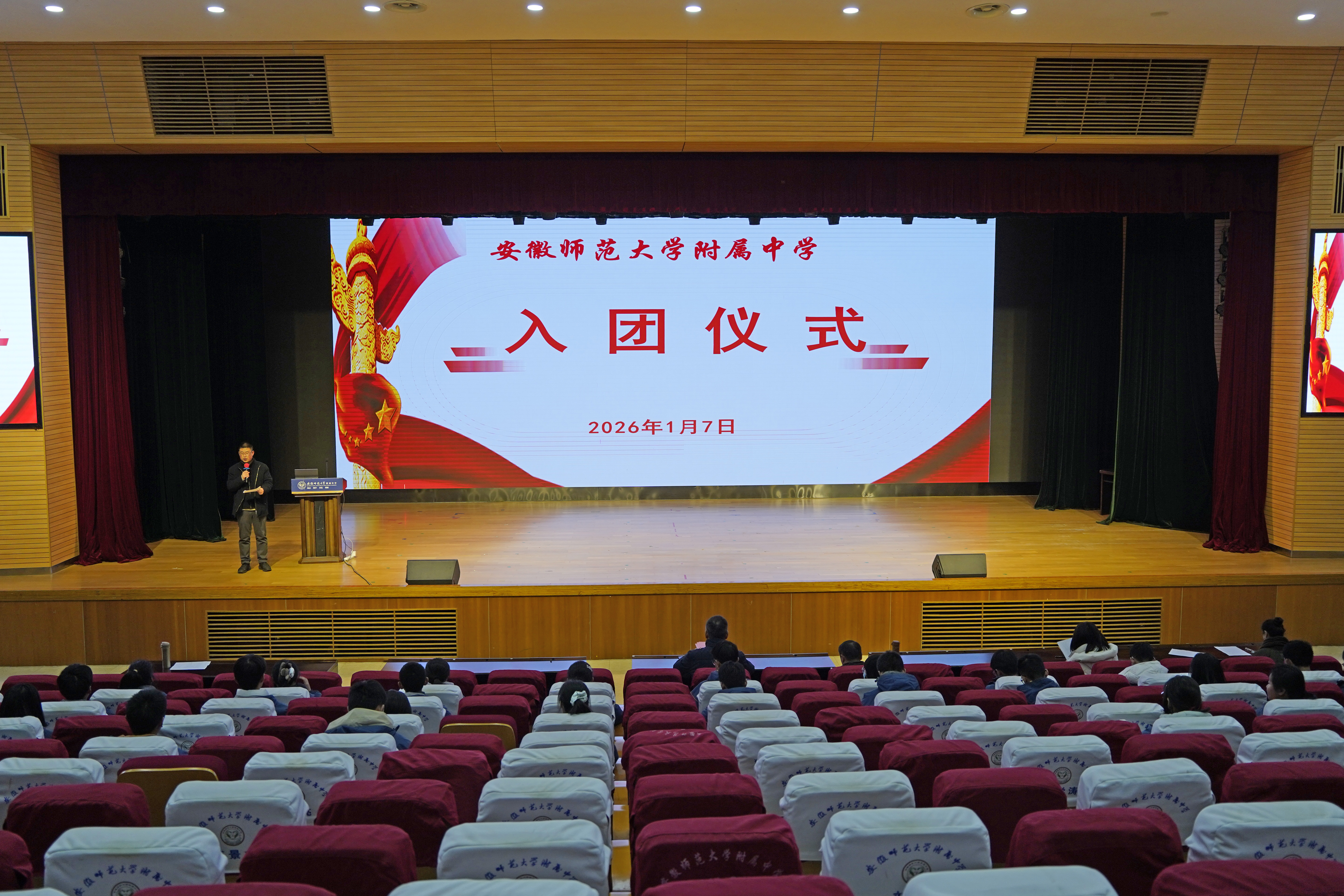 本网讯(附中 李居旖)1月7日,安徽师范大学附属中学2024-2025学年第二学期新团员入团仪式在育英楼报告厅举行。新入团学生齐聚一堂,光荣加入中国共产主义青年团。党委书记夏吉中、校长毛宣海、德育处副主任谢莉出席仪式。仪式由德育处副主任伍德生主持。