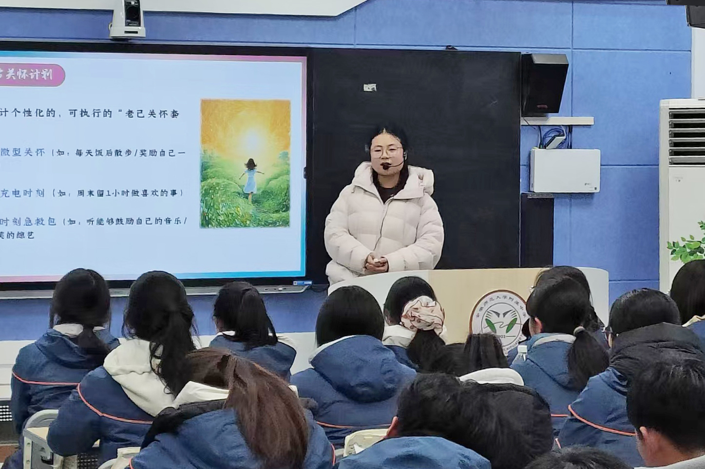 实践阶段,金玥通过《老己使用说明书》填写、情景卡片演绎、自我关怀计划制定等环节,层层突破“接纳不完美”的重点与“理论转化为行动”的难点。课堂教学资源运用得当,氛围轻松且富有深度,展现出教师对学情的精准把握与课堂驾驭能力。