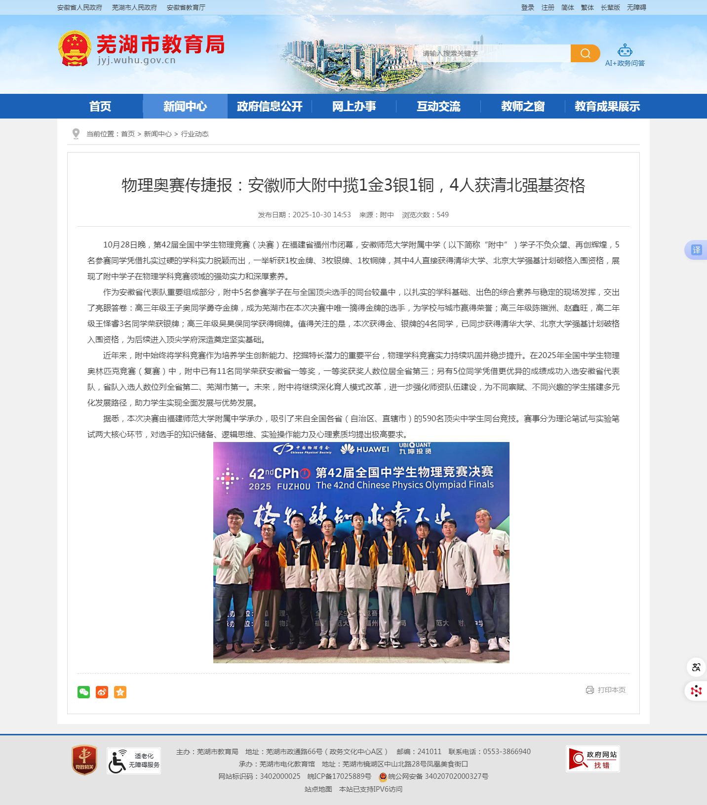 10月28日晚,第42届全国中学生物理竞赛(决赛)在福建省福州市闭幕,安徽师范大学附属中学(以下简称“附中”)学子不负众望、再创辉煌,5名参赛同学凭借扎实过硬的学科实力脱颖而出,一举斩获1枚金牌、3枚银牌、1枚铜牌,其中4人直接获得清华大学、北京大学强基计划破格入围资格,展现了附中学子在物理学科竞赛领域的强劲实力和深厚素养。