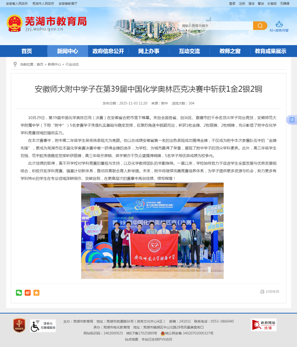 10月29日,第39届中国化学奥林匹克(决赛)在安徽省合肥市落下帷幕。来自全国各省、自治区、直辖市的千余名顶尖学子同台竞技,安徽师范大学附属中学(下称“附中”)5名参赛学子凭借扎实基础与稳定发挥,在激烈角逐中脱颖而出,斩获1枚金牌、2枚银牌、2枚铜牌,充分彰显了附中在化学学科竞赛领域的强劲实力。