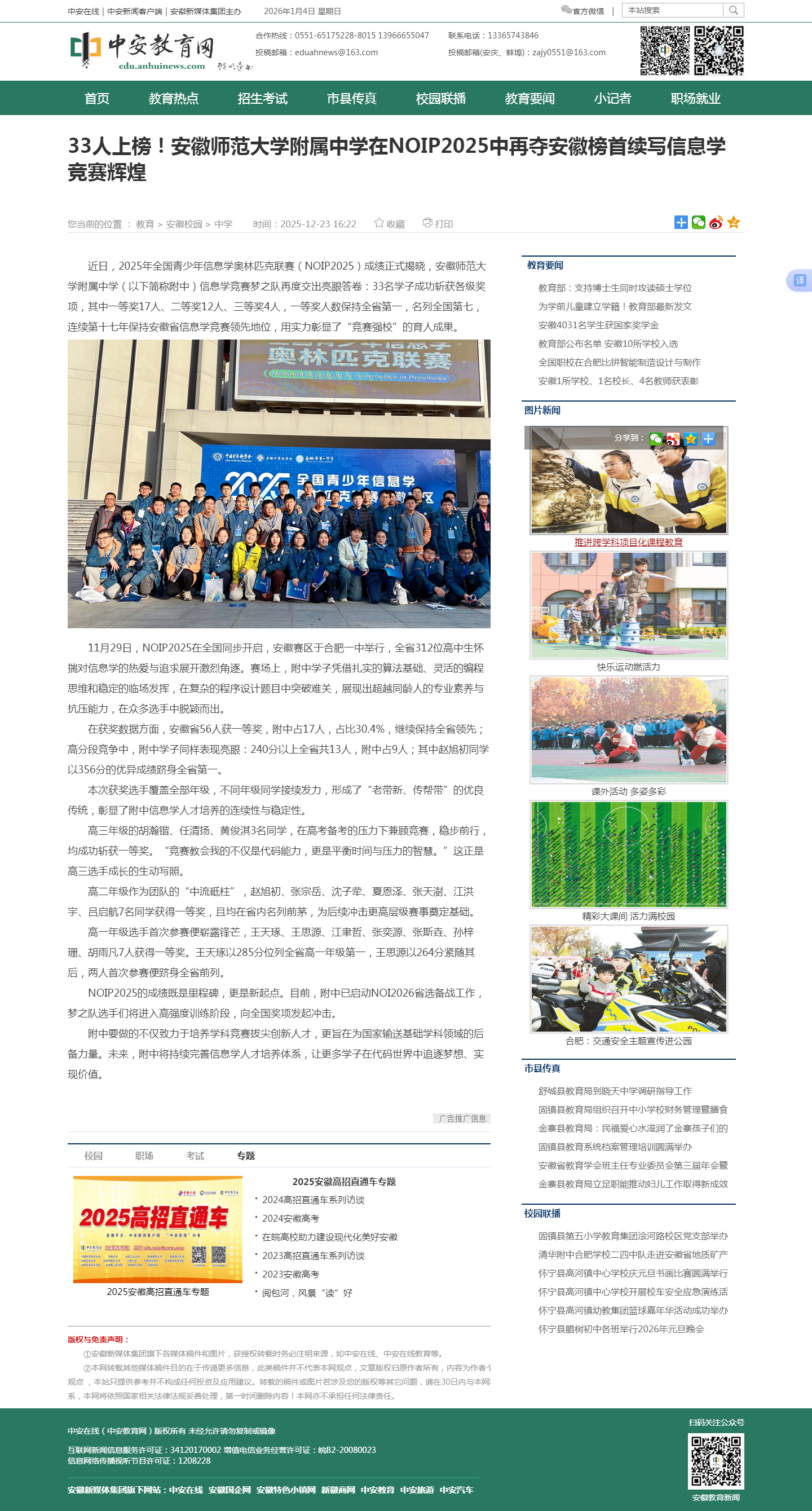 近日,2025年全国青少年信息学奥林匹克联赛(NOIP2025)成绩正式揭晓,安徽师范大学附属中学(以下简称附中)信息学竞赛梦之队再度交出亮眼答卷:33名学子成功斩获各级奖项,其中一等奖17人、二等奖12人、三等奖4人,一等奖人数保持全省第一,名列全国第七,连续第十七年保持安徽省信息学竞赛领先地位,用实力彰显了“竞赛强校”的育人成果。